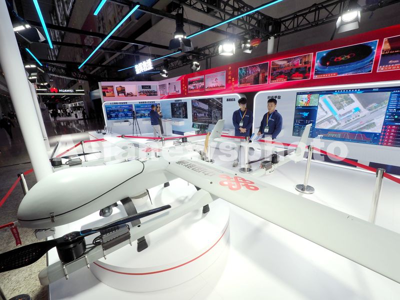 图片说明:2024年11月13日,北京国家会议中心,观众在2024中国国际应急管理展览会中国联通展位上参观“大型油动长航时复合翼垂直起降无人机”。