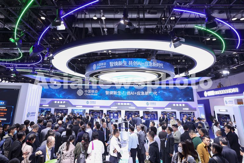 图片说明:2024中国国际应急管理展览会,参观者在观看中国移动展出的AI+应急方面成果。