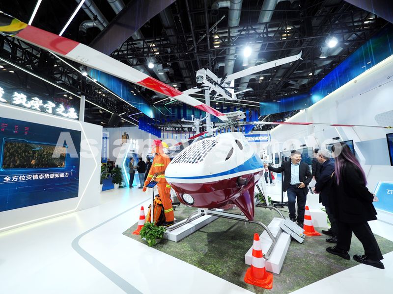 图片说明:2024年11月13日,北京国家会议中心,观众在2024中国国际应急管理展览会上参观“大型无人直升机应急救援平台”。