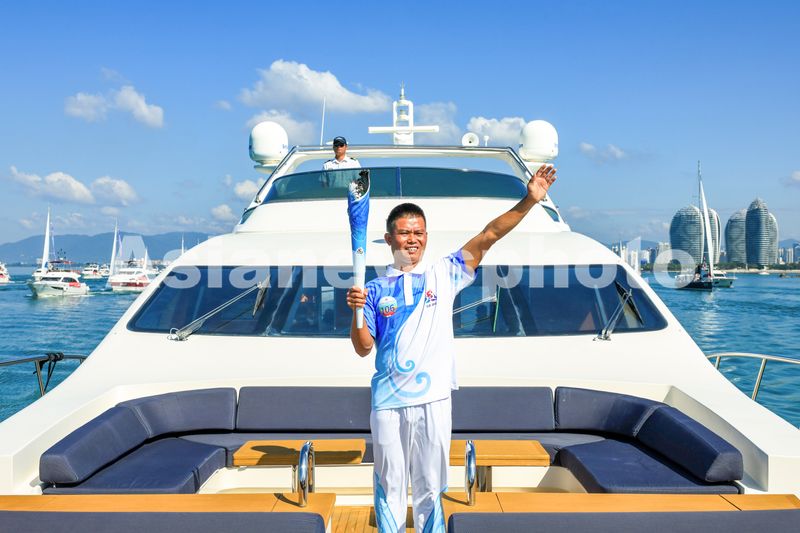 图片说明:11月17日,在海南三亚凤凰岛一带海域,火炬手乘坐游艇在海上传递。