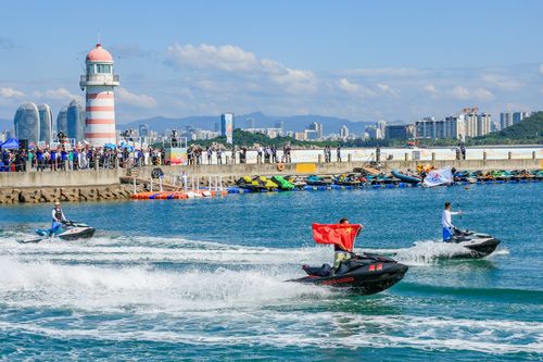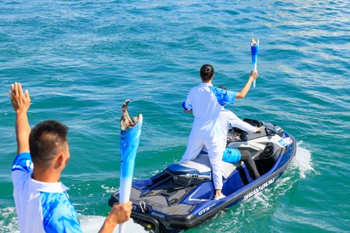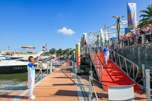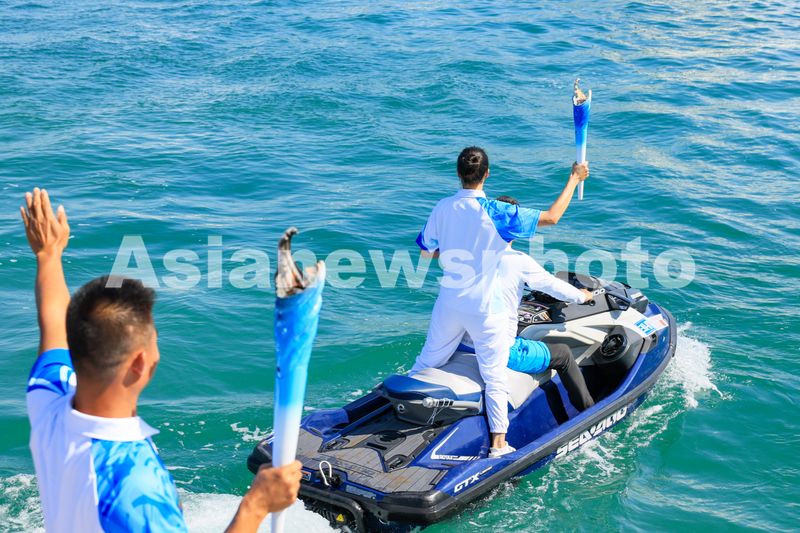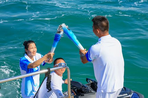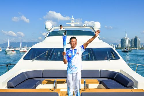 图片说明:11月17日,在海南三亚半山半岛帆船港一带海域,游艇上的火炬手与下一棒火炬手挥手告别。