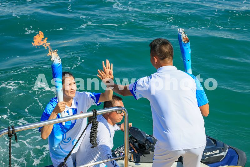 图片说明:11月17日,在海南三亚半山半岛帆船港一带海域,游艇上的火炬手(右)将火炬火种传递给下一棒火炬手。