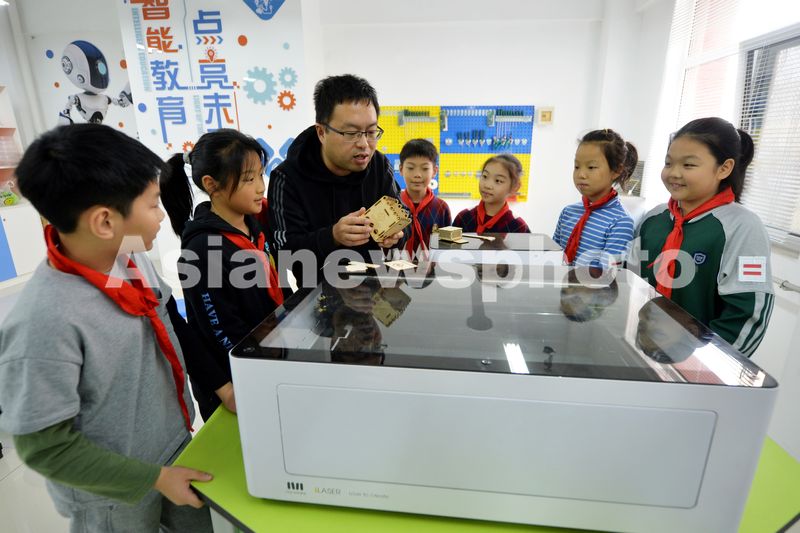 2024年11月19日,在山东青岛第二实验小学举办的第二届校园科技节活动上,老师为学生讲解激光雕刻机工作原理。