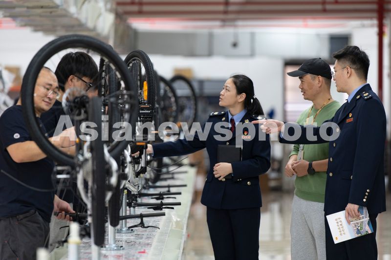 2024年11月15日,浙江省金华市义乌洛克体育用品有限公司里,当地税务工作人员正在了解出口海外的山地自行车生产销售情况,同时积极宣传出口退税政策。