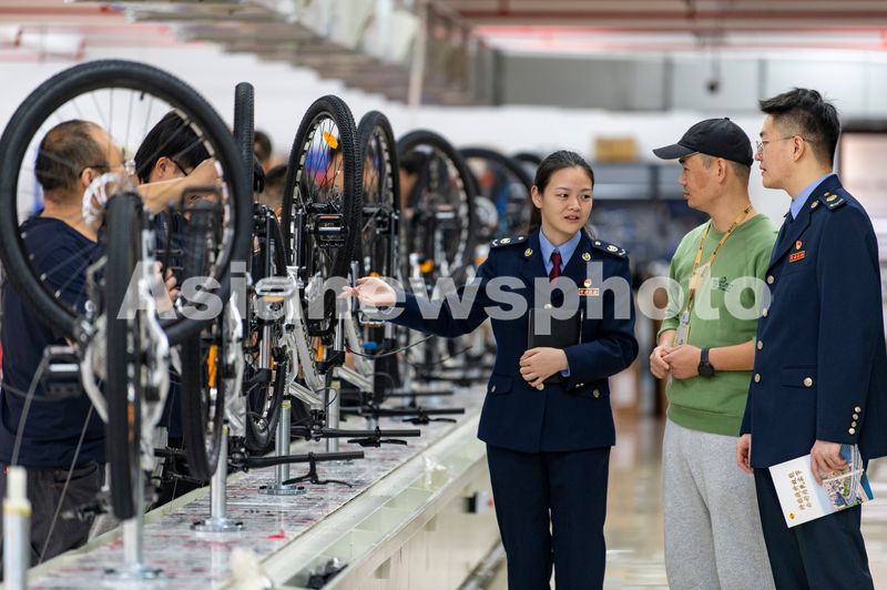 2024年11月15日,浙江省金华市义乌洛克体育用品有限公司里,当地税务工作人员正在了解出口海外的山地自行车生产销售情况,同时积极宣传出口退税政策。