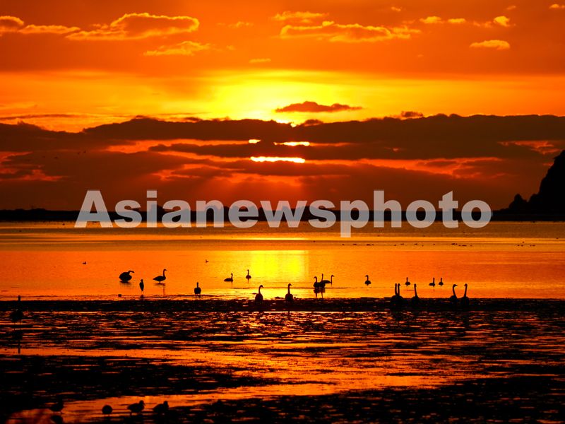 2024年11月19日清晨,在山东省荣成市大天鹅自然保护区成山天鹅湖畔,大天鹅在晨曦朝霞中飞舞、引颈高歌,构成一幅和谐美丽的生态画卷。