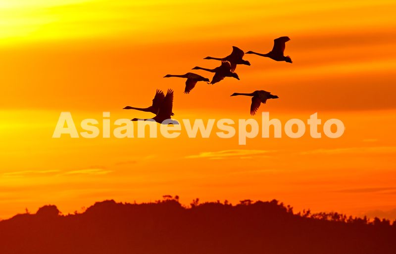 2024年11月19日清晨,在山东省荣成市大天鹅自然保护区成山天鹅湖畔,大天鹅在晨曦朝霞中飞舞、引颈高歌。