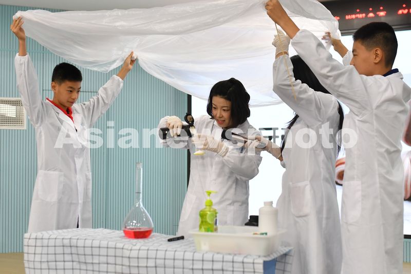 2024年11月19日,在山东青岛第二实验小学举办的第二届校园科技节活动上,科普老师在现场为学生做科学实验。