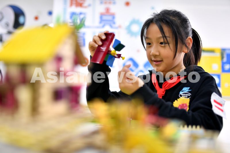 2024年11月19日,在山东青岛第二实验小学举办的第二届校园科技节活动上,一名学生在调试安装风车。