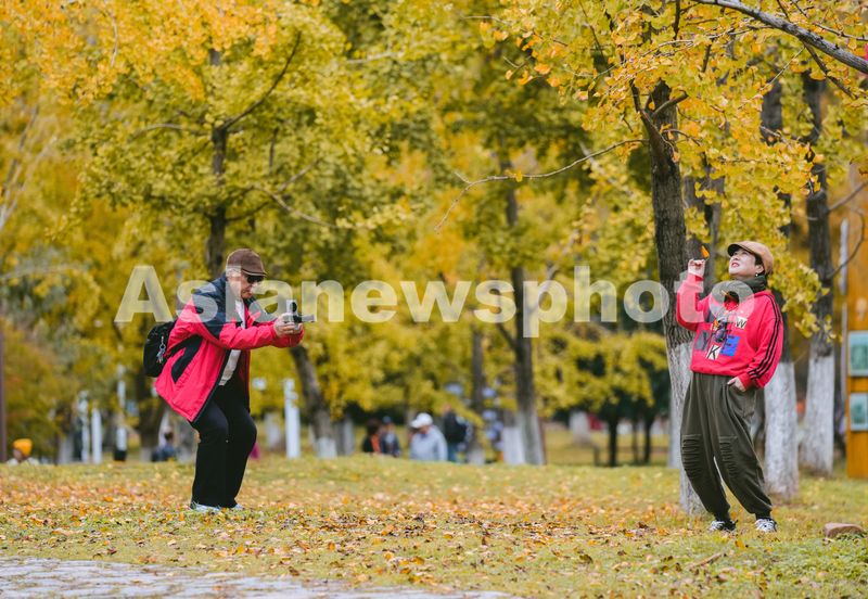 图片说明:2024年11月18日,浙江省湖州市长兴县小浦镇八都岕十里银杏长廊,游客在银杏树下拍照赏景。