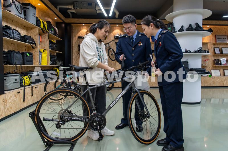 2024年11月15日,浙江省金华市义乌洛克体育用品有限公司里,当地税务工作人员正在了解出口海外的山地自行车生产销售情况,同时积极宣传出口退税政策。