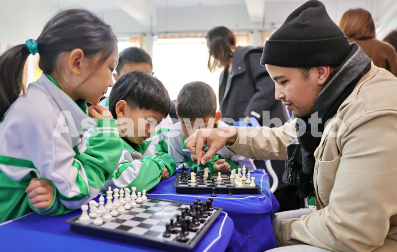 图片说明:2024年11月22日,来自“一带一路”国家的外籍棋手指导河北省秦皇岛市海港区建设路小学学生学习国际象棋。