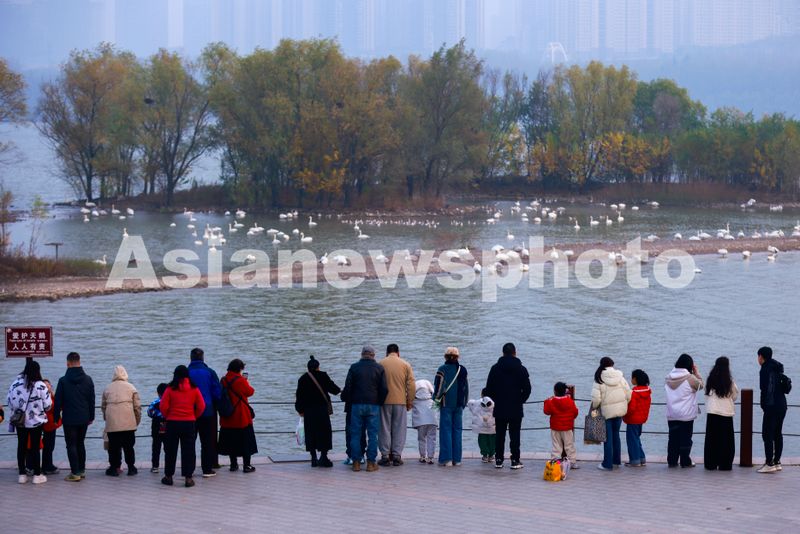图片说明:2024年11月23日,游客在河南省三门峡市天鹅湖国家城市湿地公园观赏天鹅。