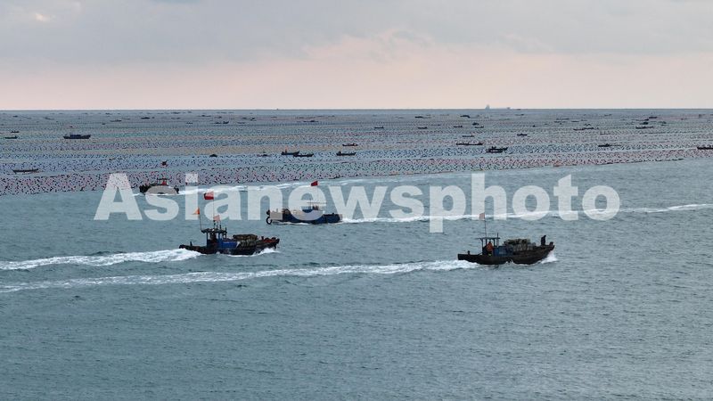 2024年11月25日,山东省荣成市爱伦湾海洋牧场海带养殖区,养殖工人在插播海带苗,从事海带“插秧”作业的船只往来穿梭,整个海区一派繁忙的生产景象。