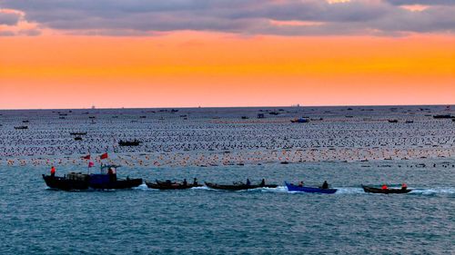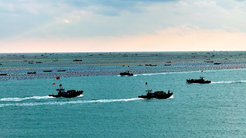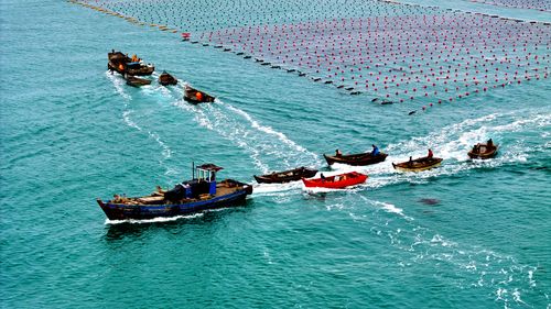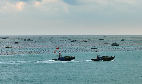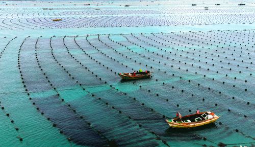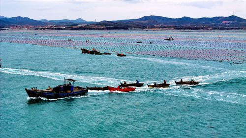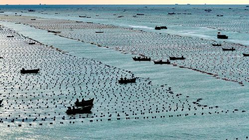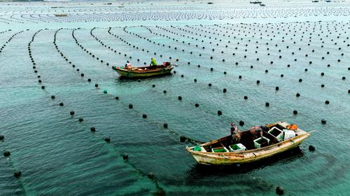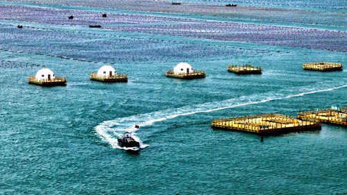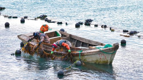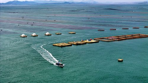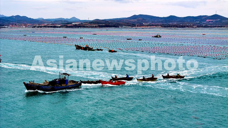 2024年11月25日,山东省荣成市爱伦湾海洋牧场海带养殖区,养殖工人在插播海带苗,整个海区一派繁忙的生产景象。