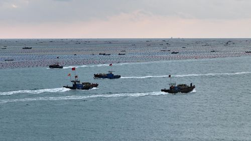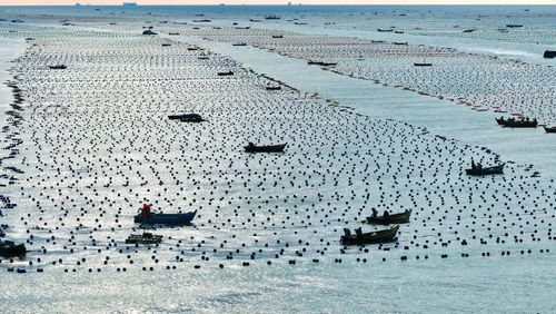 2024年11月25日,山东省荣成市爱伦湾海洋牧场海带养殖区,养殖工人在插播海带苗,从事海带“插秧”作业的船只往来穿梭,整个海区一派繁忙的生产景象。