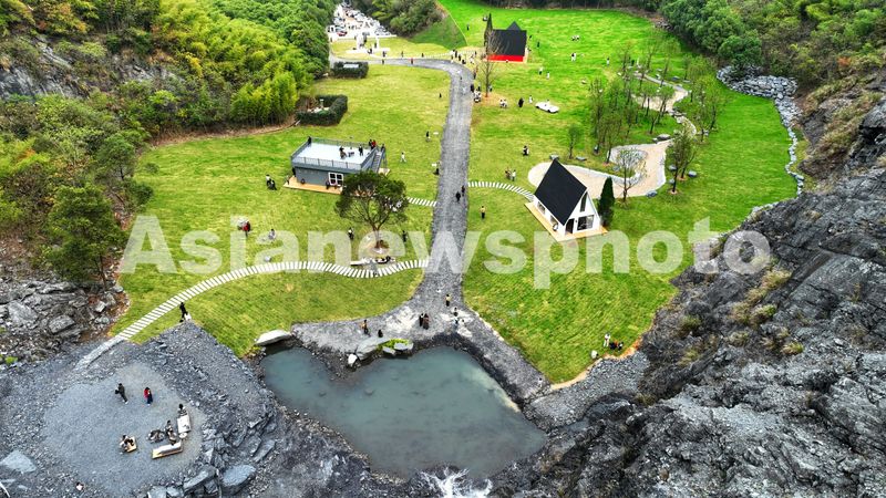2024年11月24日,游客在浙江省湖州市德清县莫干山镇五四村一家矿坑咖啡店拍照打卡。近年来,五四村牢固树立和践行“绿水青山就是金山银山”理念,陆续关停矿山企业,积极推进美丽乡村建设,推动闲置矿山资源文旅化场景改造、文旅业态培育和文旅产品开发,让昔日废矿变身乡村旅游网红地。