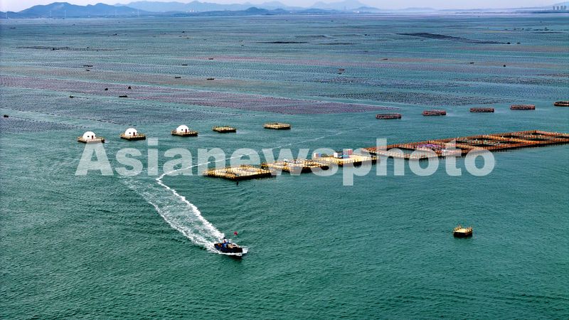 2024年11月25日,山东省荣成市爱伦湾海洋牧场海带养殖区,养殖工人在插播海带苗,整个海区一派繁忙的生产景象。