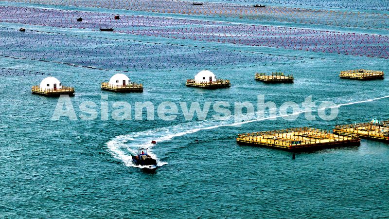 2024年11月25日,山东省荣成市爱伦湾海洋牧场海带养殖区,养殖工人在插播海带苗,整个海区一派繁忙的生产景象。