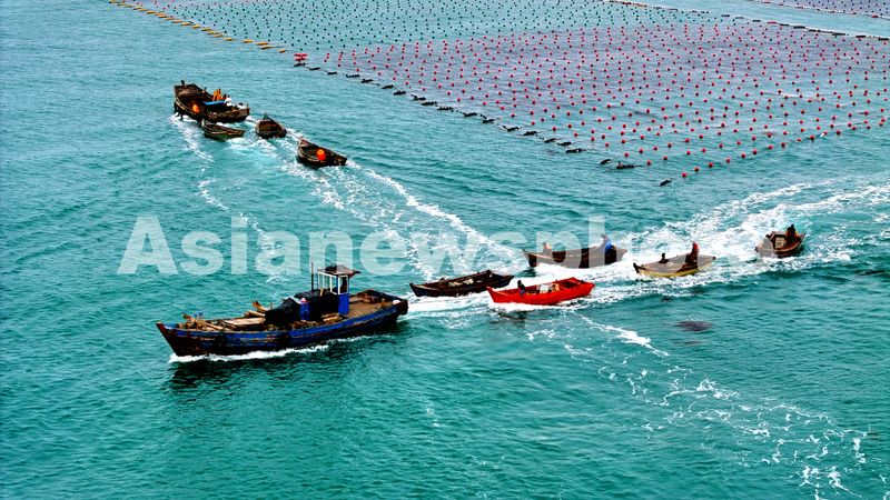 2024年11月25日,山东省荣成市爱伦湾海洋牧场海带养殖区,养殖工人在插播海带苗,整个海区一派繁忙的生产景象。