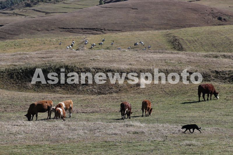 2024年11月26日,云南省昭通市昭阳区云南大山包黑颈鹤国家级自然保护区,黑颈鹤在栖息地活动。
