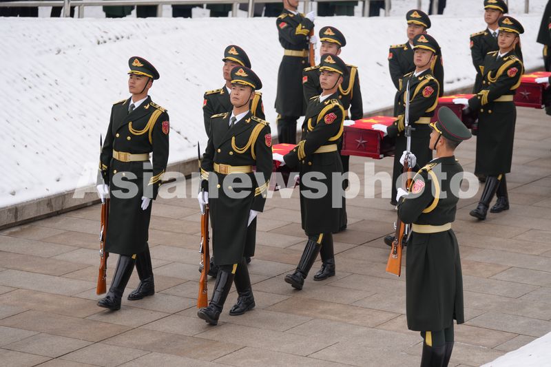 11月29日,礼兵护送志愿军烈士遗骸棺椁缓缓步入仪式现场。