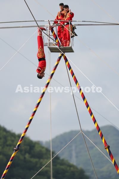 “高空王子”阿迪力·吾休尔在长80米、高21米的麻绳上表演了高难度的达瓦孜,随后团队成员又展示了穿高跟鞋走钢丝、蒙眼走钢丝、钢丝上跳舞、钢丝上骑独轮车等。