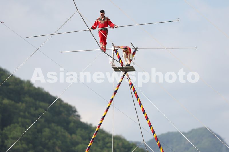 “高空王子”阿迪力·吾休尔在长80米、高21米的麻绳上表演了高难度的达瓦孜,随后团队成员又展示了穿高跟鞋走钢丝、蒙眼走钢丝、钢丝上跳舞、钢丝上骑独轮车等。