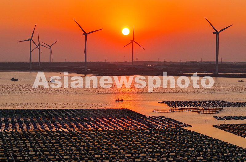 图片说明:2024年12月4日,在山东省荣成市石岛管理区桑沟湾风力发电场,风力发电机在运转工作。