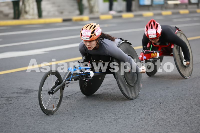 图片说明:2024年12月1日,选手在上海马拉松竞速轮椅比赛中。