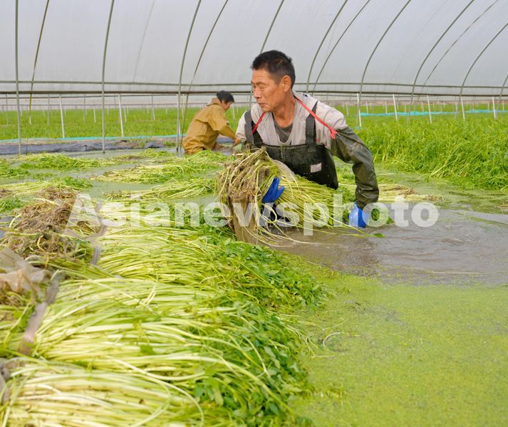 2024年12月6日,江苏省海安市墩头镇长垎村水芹菜大棚种植基地,农民正在水中采收水芹菜。