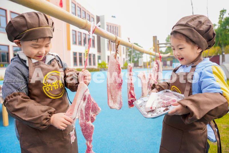 2024年12月6日,浙江省湖州市长兴县画溪街道长桥中心幼儿园,孩子们在晒腊肉。