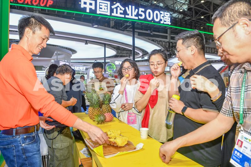 12月5日,在冬交会1号馆海南凤梨馆,嘉宾嘉宾品尝海南凤梨。