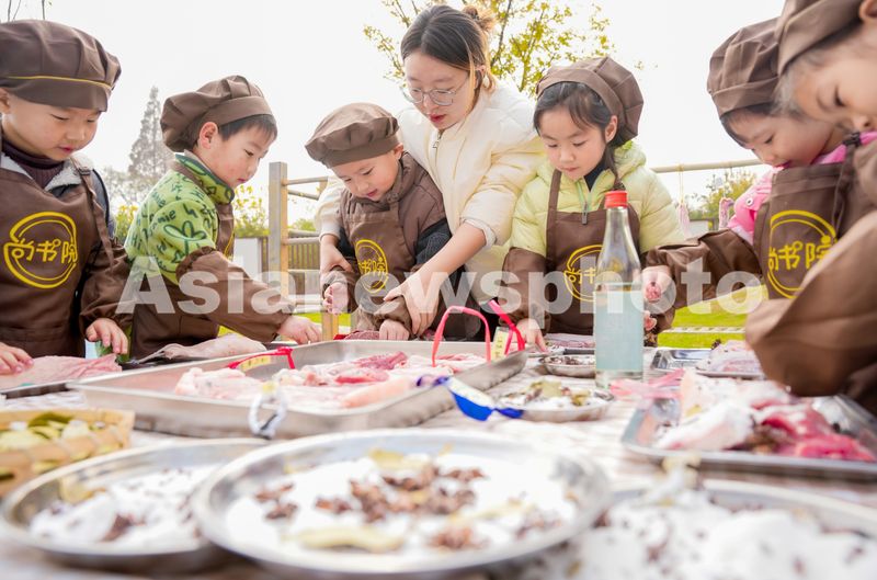 2024年12月6日,浙江省湖州市长兴县画溪街道长桥中心幼儿园,孩子们在老师的指导下腌制腊肉。