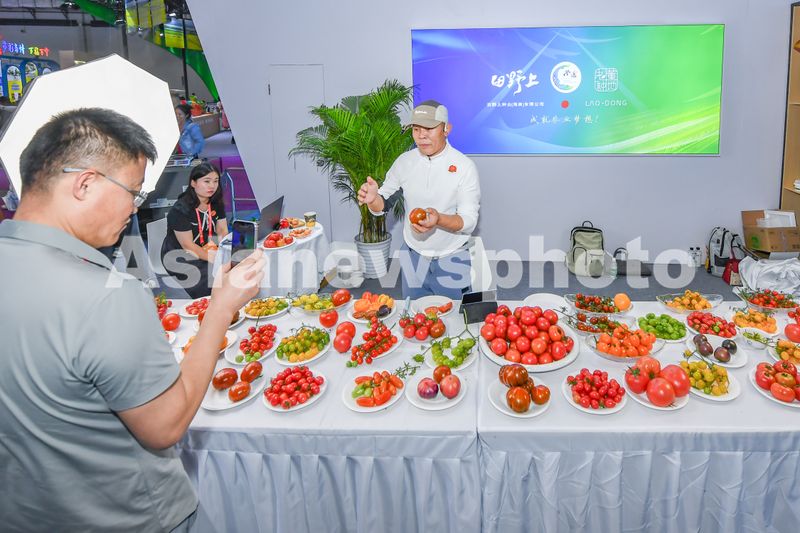 12月5日,在冬交会3号馆澄迈馆,工作人员通过直播介绍众多西红柿品种。