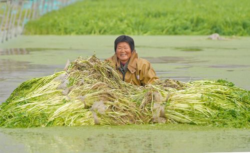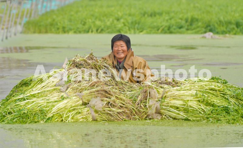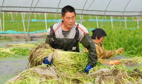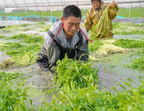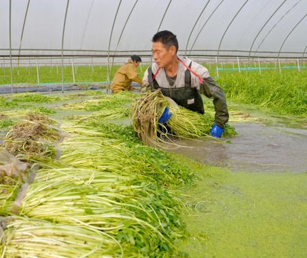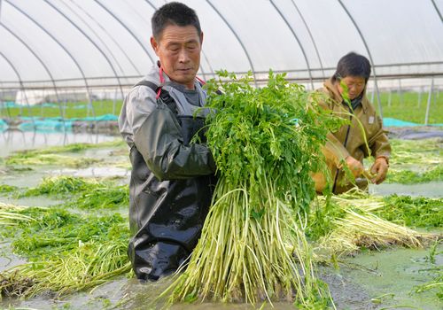 2024年12月6日,大雪节气,江苏省海安市墩头镇长垎村水芹菜大棚种植基地,农民正在水中采收水芹菜,准备供应市场。近年来,海安市墩头镇长垎村在发展设施农业中采用蔬菜大棚规模化种植生态水芹菜,实现全年多季采收,有效提高了水芹菜的产量和品质,增加了经济效益。