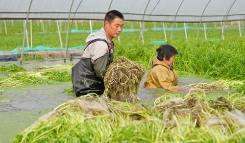 2024年12月6日,江苏省海安市墩头镇长垎村水芹菜大棚种植基地,农民正在水中采收水芹菜。