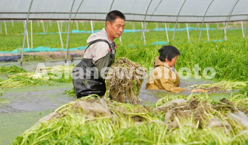 2024年12月6日,江苏省海安市墩头镇长垎村水芹菜大棚种植基地,农民正在水中采收水芹菜。