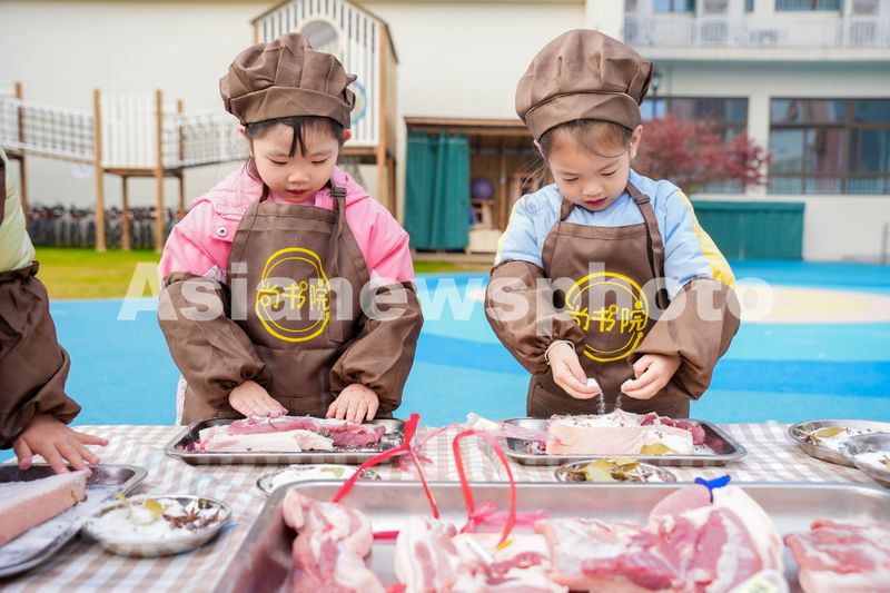 2024年12月6日,浙江省湖州市长兴县画溪街道长桥中心幼儿园,孩子们在腌制腊肉。
