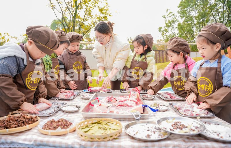 2024年12月6日,浙江省湖州市长兴县画溪街道长桥中心幼儿园,孩子们在老师的指导下腌制腊肉。