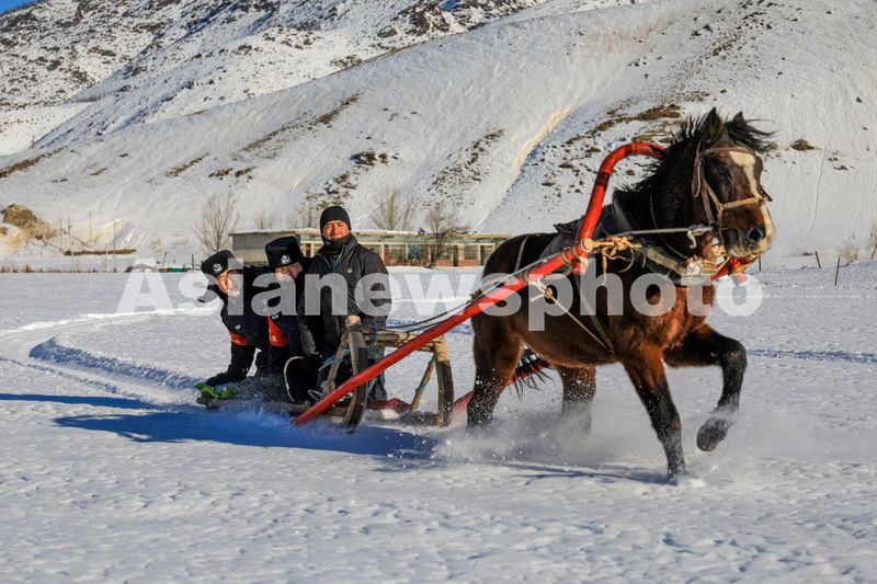 图片说明:2024年12月8日,库卫边境派出所民警搭乘马拉爬犁开展辖区走访。
