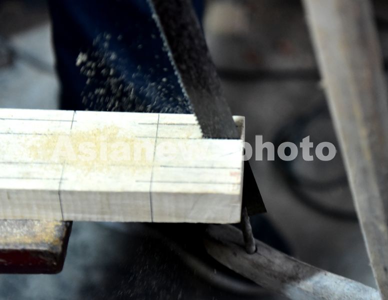 2024年12月11日,安徽含山,司绍荣在加工“记里鼓车”所需木料。