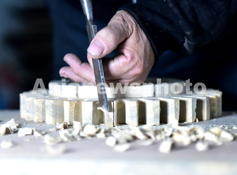 2024年12月11日,安徽含山,司绍荣在加工“记里鼓车”木质齿轮。