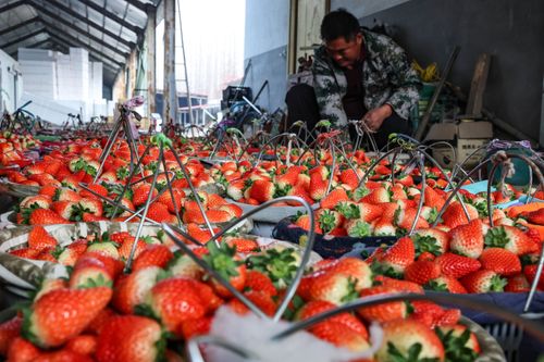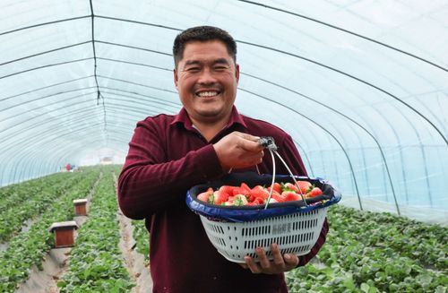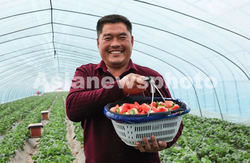 图片说明:2024年12月10日,山东省临沂市郯城县港上镇农户采成熟摘草莓供应市场。