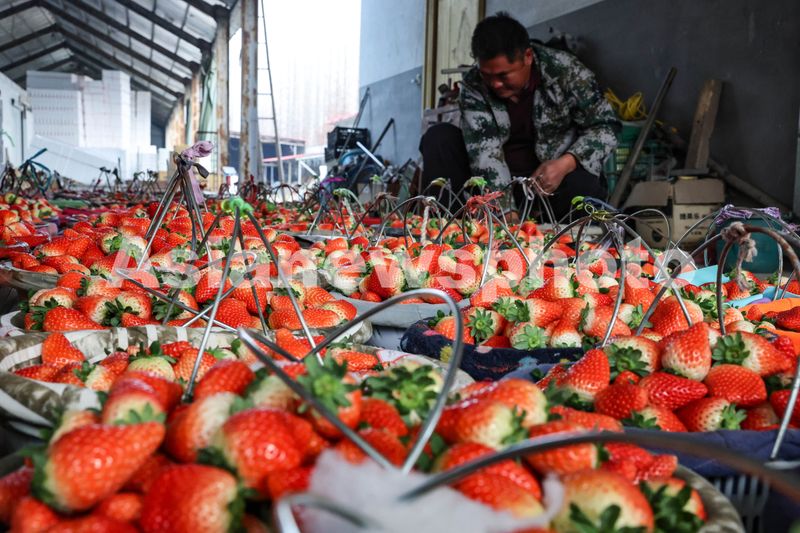 图片说明:2024年12月10日,山东省临沂市郯城县港上镇农户正在将刚刚采摘的草莓进行精选和包装。