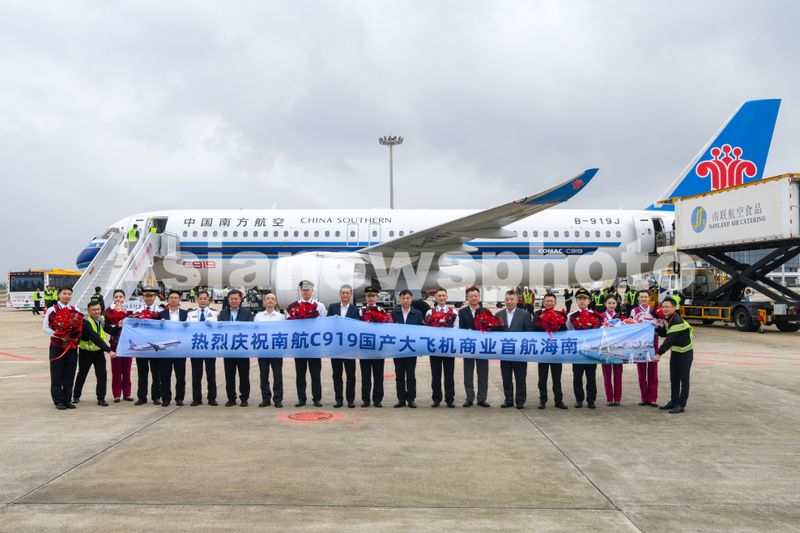2024年12月11日,国产大飞机C919在海南海口顺利完成商业飞行“首秀”,机组人员合影留念。