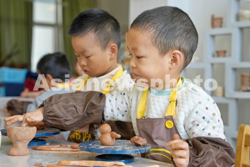 2024年12月12日,江苏省海安市南莫镇中心幼儿园,小朋友在非遗陶艺课上体验陶泥的造型制作。近年来,海安市南莫镇中心幼儿园将中华优秀传统文化融入幼儿教育中,打造“童趣非遗”特色课程,让孩子们在玩中学、学中玩,从小引导他们认知、热爱、学习和传承非遗文化。