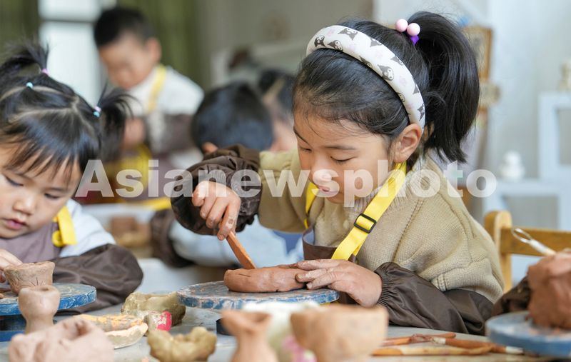 2024年12月12日,江苏省海安市南莫镇中心幼儿园,小朋友在非遗陶艺课上体验陶泥的造型制作。近年来,海安市南莫镇中心幼儿园将中华优秀传统文化融入幼儿教育中,打造“童趣非遗”特色课程,让孩子们在玩中学、学中玩,从小引导他们认知、热爱、学习和传承非遗文化。