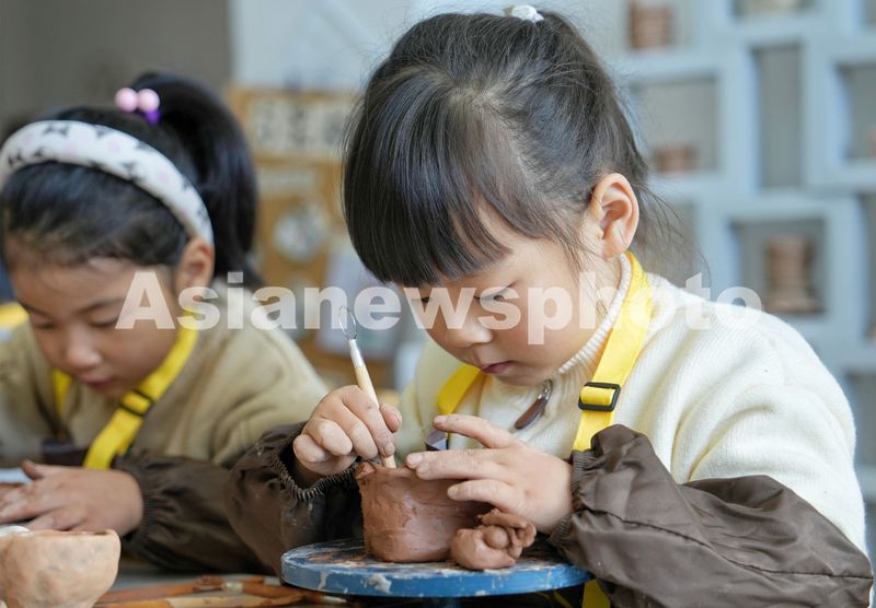 2024年12月12日,江苏省海安市南莫镇中心幼儿园,小朋友在非遗陶艺课上体验陶泥的造型制作。近年来,海安市南莫镇中心幼儿园将中华优秀传统文化融入幼儿教育中,打造“童趣非遗”特色课程,让孩子们在玩中学、学中玩,从小引导他们认知、热爱、学习和传承非遗文化。
