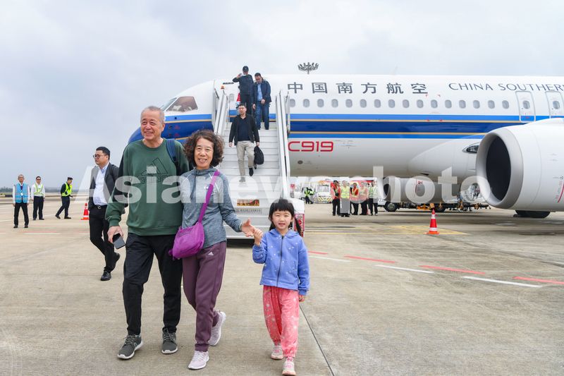 2024年12月11日,国产大飞机C919在海南海口顺利完成商业飞行“首秀”,见证“首秀”的乘客开心下机。